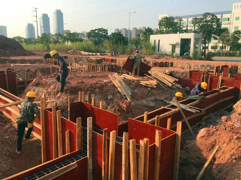 瑞聲南寧光學項目主產(chǎn)高精密手機鏡頭,包括一體式VCM雙攝、晶圓級玻璃(WLG)鏡頭、玻塑混合鏡頭等,是瑞聲核心技術(shù)之一,項目的盡快投產(chǎn)對于瑞聲公司在美國打壓中國通訊產(chǎn)業(yè)的大環(huán)境下?lián)屨籍a(chǎn)業(yè)鏈轉(zhuǎn)移先機,搶占市場份額;經(jīng)開區(qū)落實自治區(qū)強首府戰(zhàn)略、打造千億產(chǎn)業(yè)園等都有著十分重要的意義,是一個多贏格局。項目計劃2020年2月上旬正式投產(chǎn)。榮鑫公司在該項目中主要承擔附屬工程施工,包括設(shè)備用房、污水處理廠房、危品庫、空壓機房主體施工及園區(qū)道路、綠化等,是名符其實的配角,但在項目的前期階段,聚光燈卻始終照在這“配角”的身上。附屬工程中,設(shè)備用房、污水處理廠房等建筑面積共4000平方米,是項目裝修、安裝的基礎(chǔ)工程,投產(chǎn)倒排工期要求2019年12月25日前必須完成并交付安裝單位(道路綠化等配合項目總進度,不在此列),工期不足三個月!該部分用房面積雖不大,且大部分只有兩層,但由于特殊設(shè)計要求且項目處回填區(qū)域,涉及樁基、深基坑(5.5米)、高支模(8.3米)、防滲防腐等土建施工難點、費時點,不可控因素多,給工程按期完工帶來了極大的困難。該部分項目工程量不大,與后期裝修、安裝關(guān)系密切,本應由裝修總包單位統(tǒng)一施工,但裝修單位一再推托,坦言不可能完成。最終管委將此部分項目授與了榮鑫公司。此時,裝修、安裝單位在觀望,業(yè)主、建設(shè)主管部門也都在捏把汗。