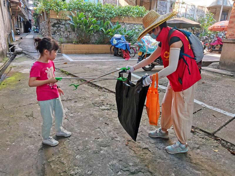 雖然他們年紀(jì)小,但是創(chuàng)城志愿服務(wù)的熱情卻十分高昂。李悅歌小朋友早上一到工作地點就迫不及待地去找工具,一直問媽媽我們能做什么,我們要做什么,甚至連早餐都顧不上吃。一個上午她跟隨著媽媽,對槎路社區(qū)的小廣場進(jìn)行了打掃,清理了球場維修時打碎的玻璃渣子和積水區(qū)。隨后,她又跟隨著媽媽進(jìn)入到小區(qū)里,撿拾居民丟棄在外面的垃圾。一開始由于個子比較小,拿的夾子有點長,她控制不好,怎么夾都夾不住那個小小的煙頭,經(jīng)過她反復(fù)實驗終于掌握了力道,知道夾子靠下面的部分比較好控制,容易把物品夾起來。在掌握了竅門以后,她開啟了瘋狂“尋寶”的過程。她就像發(fā)現(xiàn)寶藏一樣去發(fā)現(xiàn)丟棄在樹葉、花圃帶、水溝里面的煙頭,甚至比志愿者姐姐和阿姨們發(fā)現(xiàn)的還快,每當(dāng)她撿拾到煙頭,她都特別的興奮。志愿者阿姨們也從草叢里將垃圾撿拾出來,讓她負(fù)責(zé)把煙頭和垃圾放到黑色的垃圾袋里。