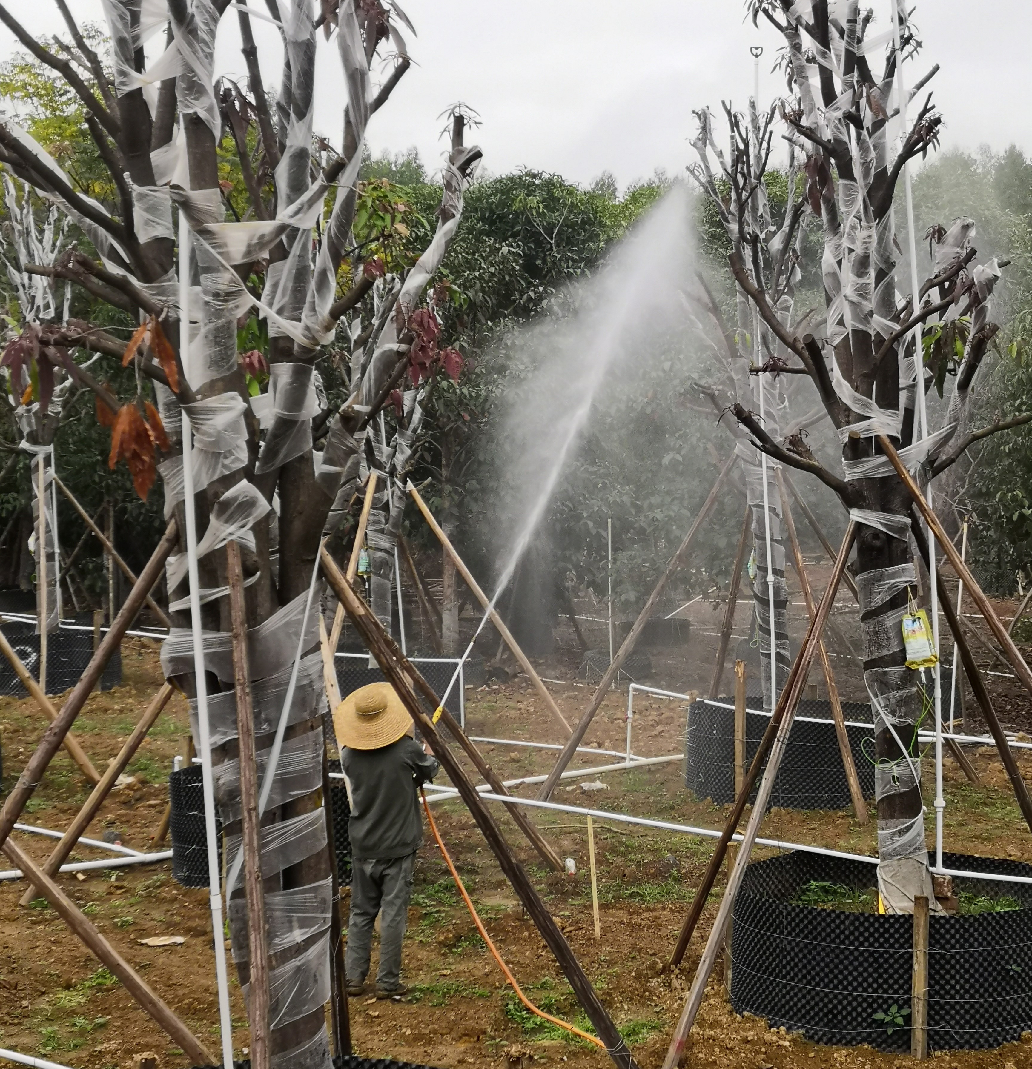 針對影響扁桃移植存活率的主要原因,QC小組具體采取了以下措施:一是保留扁桃骨架,確保樹形完整,截枝時一次性垂直切割并處理好傷口;二是采用保水保溫性薄膜,間隔性覆蓋扁桃80%的主要軀干,預(yù)留部分區(qū)域確保透氣性;三是在高溫多雨季節(jié)加大“高效氯氰菊酯”等預(yù)防性藥物的噴灑量和噴灑次數(shù),并做好病蟲害的監(jiān)控和動態(tài)防治;四是種植前對場地進行尿素及復(fù)合肥的噴施和翻耕,種植后施放生根劑,并持續(xù)對扁桃溫濕度、土壤PH值進行實施監(jiān)測,適時追肥,調(diào)節(jié)土壤至偏酸性。