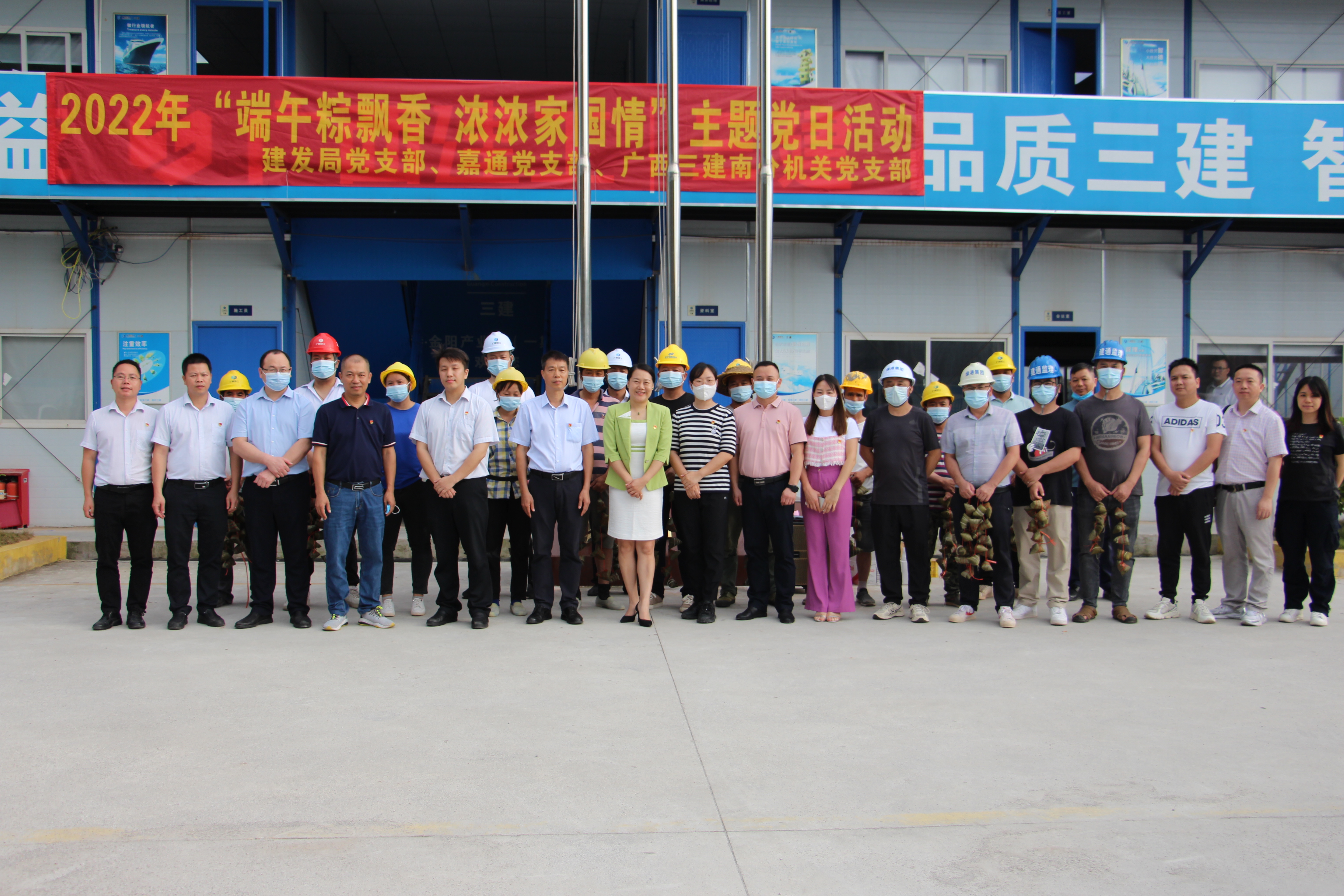 荷月繁花似錦來,粽米飄香溫情至。端午佳節(jié)將至,為進(jìn)一步傳承中華民族傳統(tǒng)文化,深入挖掘端午節(jié)的文化內(nèi)涵,增強(qiáng)文化自信,弘揚(yáng)新時代愛國主義精神,涵養(yǎng)廣大黨員的家國情懷,6月1日,嘉通公司黨支部聯(lián)合經(jīng)開區(qū)建設(shè)發(fā)展局黨支部、廣西三建南分機(jī)關(guān)黨支部深入綠港?金陽產(chǎn)業(yè)城項(xiàng)目開展2022年“端午粽飄香 濃濃家國情”主題黨日活動,為項(xiàng)目一線工人送去粽子等慰問品以及節(jié)日問候。綠港集團(tuán)黨委委員、副總經(jīng)理、嘉通黨支部書記黃麗琴以及嘉通公司黨支部全體黨員參加活動。