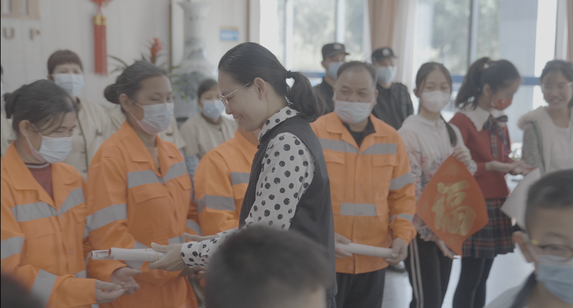 一平一仄譜喜悅,一撇一捺書祝福,活動最后,公司領(lǐng)導(dǎo)及志愿者們向30名來自一線的市政、綠化工人與物業(yè)服務(wù)人員贈送了春聯(lián),并向他們表達(dá)了濃濃的關(guān)懷和新春祝福?!按汗?jié)貼春聯(lián)是我們的傳統(tǒng)習(xí)俗,過年的時(shí)候在家門口貼上親手寫的“?!弊志透幸饬x了,非常感謝集團(tuán)公司在每年春節(jié)即將到來之際給我們送來這么好的禮物。”榮鑫公司綠化工人唐素廂拿到春聯(lián)后高興地說。