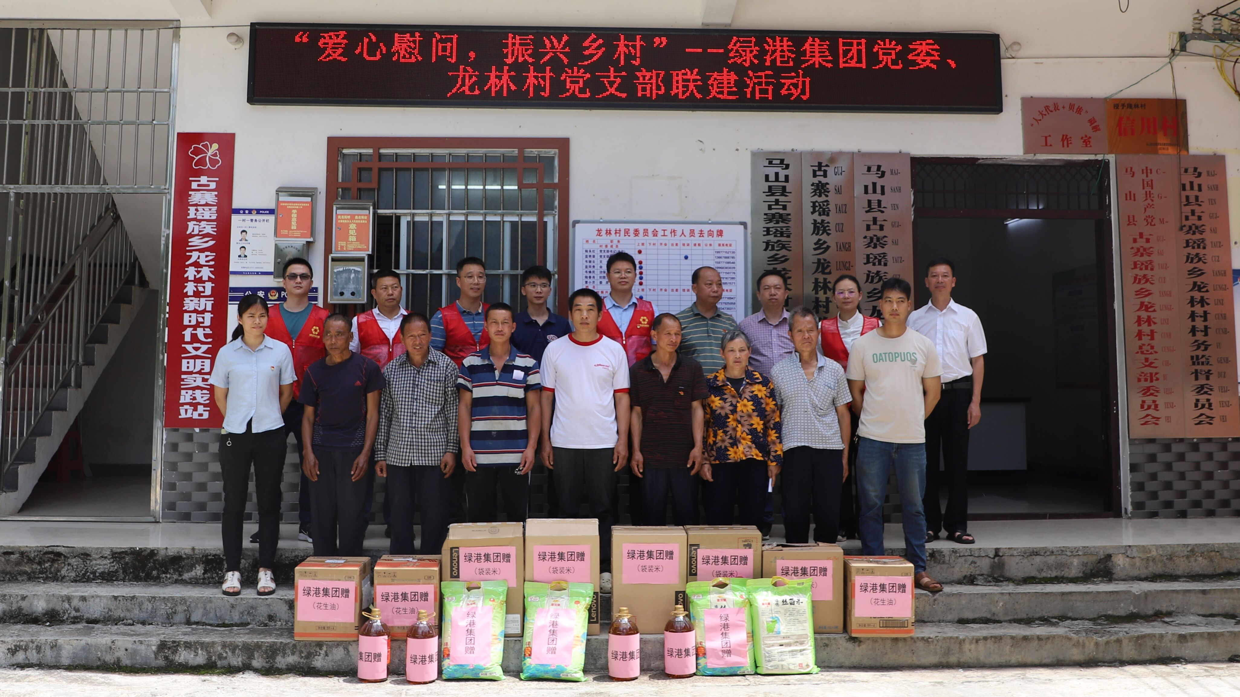 5月29日,綠港集團(tuán)黨委副書記、總經(jīng)理鄧?yán)^慧,黨委委員、副總經(jīng)理陸羿冰,黨委委員、副總經(jīng)理陽(yáng)正輝,以及集團(tuán)黨委辦和萬(wàn)方公司黨支部的部分同志代表集團(tuán)黨委,到對(duì)口幫扶的馬山縣古寨瑤族鄉(xiāng)龍林村開展村企聯(lián)建慰問(wèn)活動(dòng)。綠港集團(tuán)派駐龍林村第一書記梁華以及龍林村干部、駐村工作隊(duì)員一起參加了活動(dòng)。