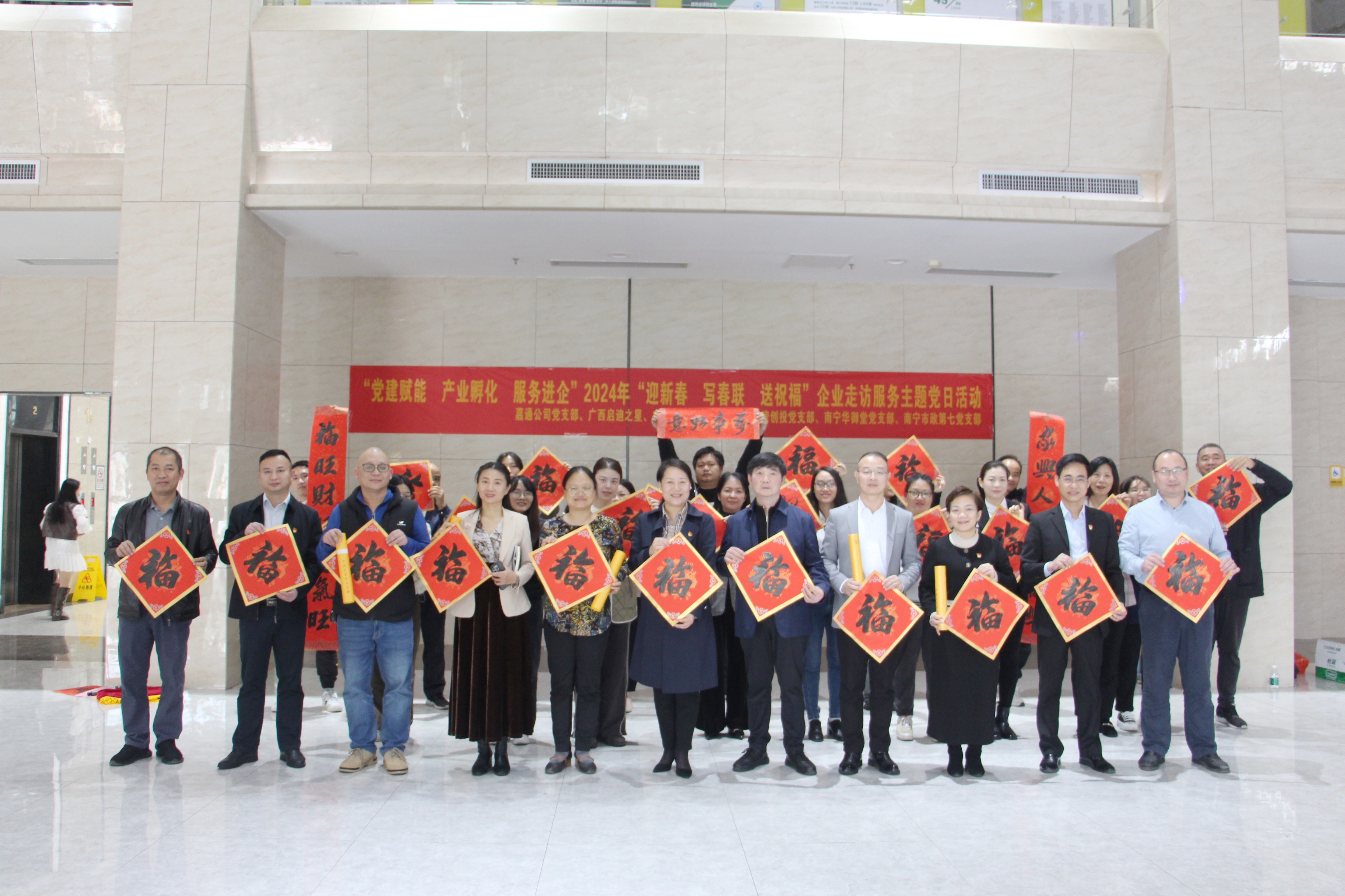 為深化黨建與業(yè)務(wù)融合,通過(guò)黨建引領(lǐng)提升企業(yè)服務(wù)質(zhì)量,發(fā)揮好產(chǎn)業(yè)經(jīng)濟(jì)穩(wěn)定器功能,以做強(qiáng)“鏈上黨建”推動(dòng)產(chǎn)業(yè)高質(zhì)量發(fā)展,1月19日,嘉通公司黨支部深入金凱工業(yè)園聯(lián)合廣西啟迪之星公司、廣西器檢中心黨支部、北部灣創(chuàng)投黨支部、南寧華御堂黨支部、南寧市政第七黨支部開展“黨建賦能 產(chǎn)業(yè)孵化 服務(wù)進(jìn)企”2024年“迎新春 寫春聯(lián) 送祝福”企業(yè)走訪服務(wù)主題黨日活動(dòng),嘉通公司黨支部黨員代表及職工代表參加本次活動(dòng)。